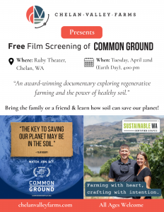 Earth Day Show on Tuesday April 22 at 4 PM- Chelan Valley Farms sponsors a free Earth Day show at 4 PM Tuesday April 22, 2025 . The film “Common Ground” is an award-winning documentary about regenerative farming and the power of healthy soil. Join us for this inspiring and educational film! With Jason Momoa, Woody Harrelson, Laura Dern, Rosario Dawson, Donald Glover and Ian Somerhalder.