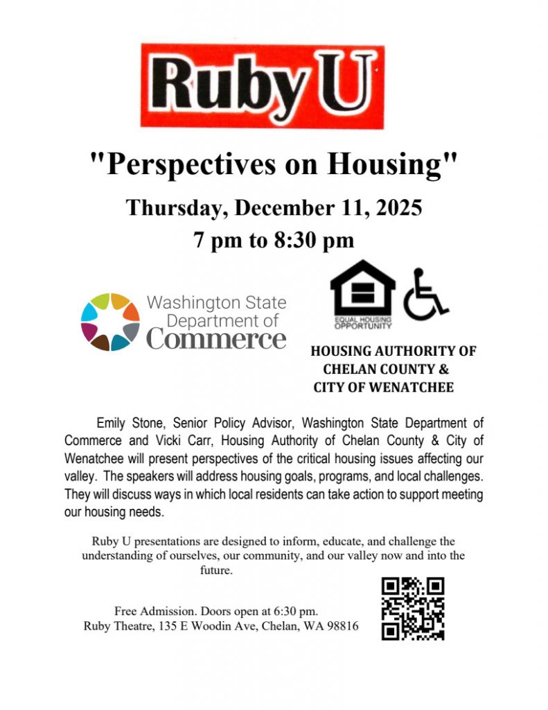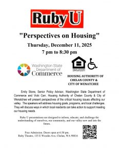 Ruby U: “Perspectives on Housing” at 7 pm on Thursday December 11 brings experts from the Washington State Department of Commerce and Housing Authority of Chelan County and the City of Wenatchee to present challenges and solutions for housing in Chelan Valley. Free admission. We hope you can join us!